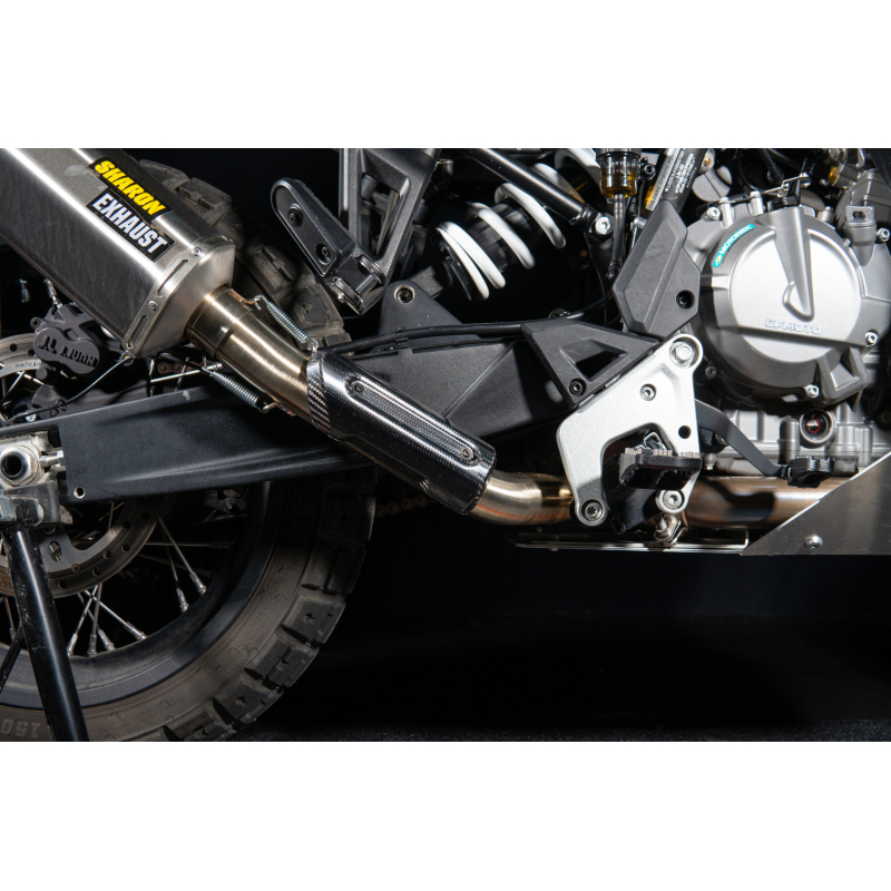 Tento výfukový systém, navrhnutý špeciálne pre CFMOTO 800 MT-X, kombinuje čistý a účelný dizajn s vysoko kvalitnými materiálmi a precíznym spracovaním. Systém je navrhnutý bez katalyzátora, pričom zostáva plne kompatibilný s elektronikou motocykla a nespúšťa žiadne chybové kódy ani výstražné svetlá. Jeho kompaktný, pretekmi inšpirovaný vzhľad prirodzene zapadá do agresívneho dobrodružného štýlu motocykla a zároveň si zachováva kultivovaný a prémiový vzhľad.